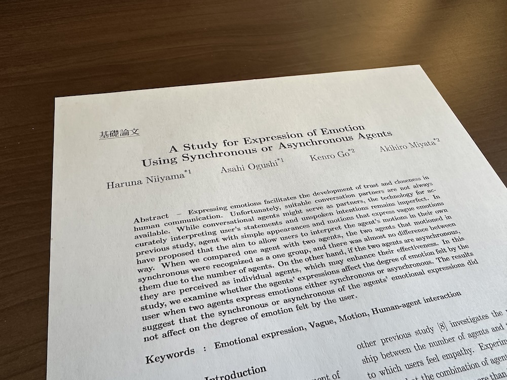 Haruna Niiyama, Asahi Ogushi, Kenro Go, and Akihiro Miyata: A Study for Expression of Emotion Using Synchronous or Asynchronous Agents. Transactions of the Virtual Reality Society of Japan, Vol. 31, No.1 (2026掲載予定).